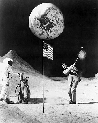 First, and I think the lamest, was when Alan Shepard played golf on the moon. This –white guys with buzz cuts exporting our most square and “establishment” sports to space — could be used as a metaphor for failure to take advantage of an awesome situation. “It’s like playing golf on the moon.” Some cooler sports might have been Zen archery, capture the flag, Moon’s strongest man competition, and gymnastics. Could you imagine the amazing floor routine Svetlana Boginskaya could have created unfettered by the earth’s gravity?